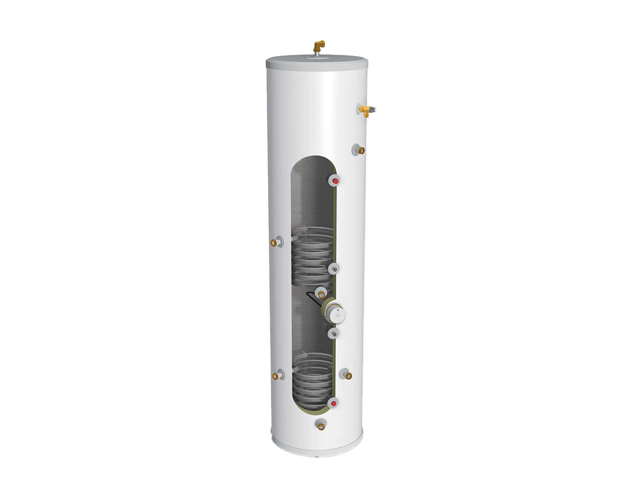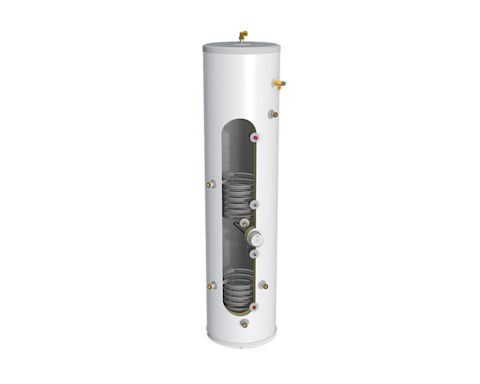 The indirect cylinders are heated by a conventional boiler (gas or oil) through a second high-performance coil. The direct models are electrically heated, using the supplied 3kW immersion heater and also incorporate a high-performance solar coil.